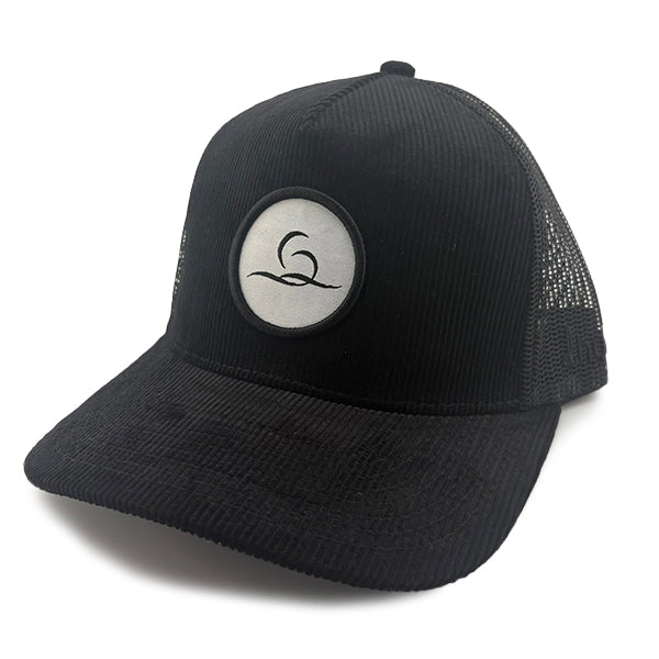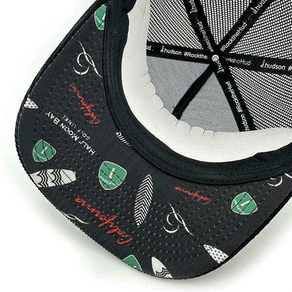 Hudson Corduroy golf hat with Half Moon Bay Golf Links wave logo patch on front. Printed with HMBGL logo, Highway 1 sign and surfboards under the bill for extra flair. Trucker style snap back.
