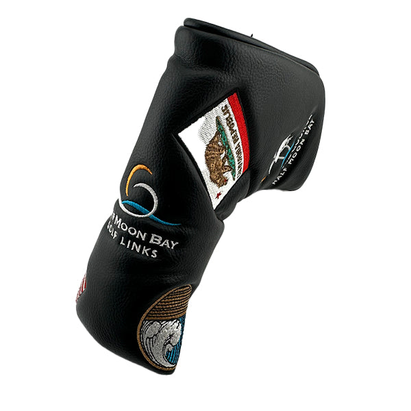 Unique putter cover for blade putters with 7 embroidered logos including course logos, Highway 1 sign, California flag and USA flag. This is a beautifully made souvenir of your time on the courses. This super high-quality head cover will protect the most important club in your bag!